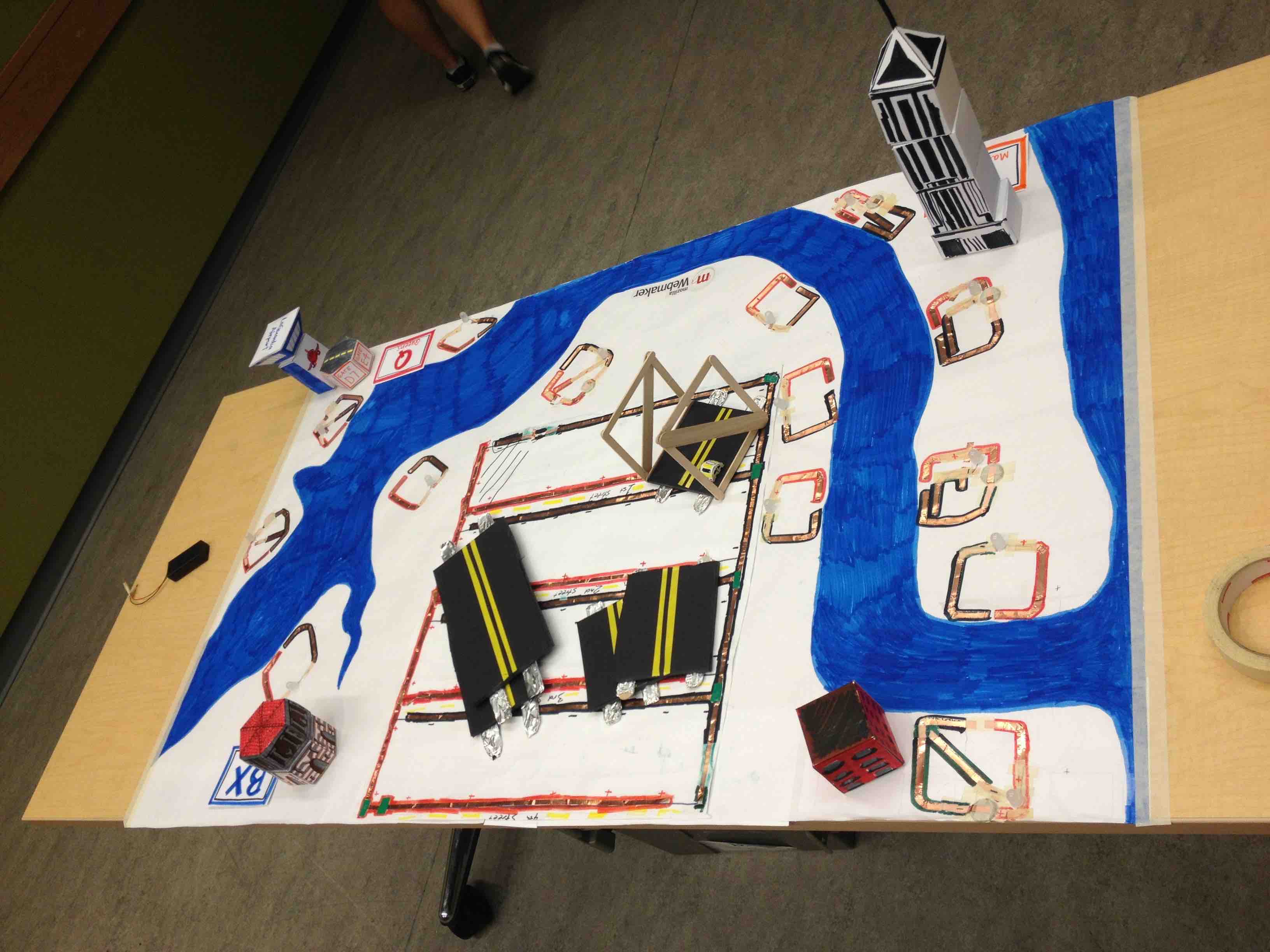 Our activity was very similar to the Reverse Field Trips. Kids could come and build buildings with LED's on them, or build bridges. Plus we had the web station as well. We built a new map for this event, with 3 boroughs - The Bronx, Manhattan and Queens - for them to add buildings to, with the focus mainly on the Bronx. The big difference was the bridge system on our circuit map. The bridges would connect the circuit themselves and would like up an LED on the map. It was really cool!