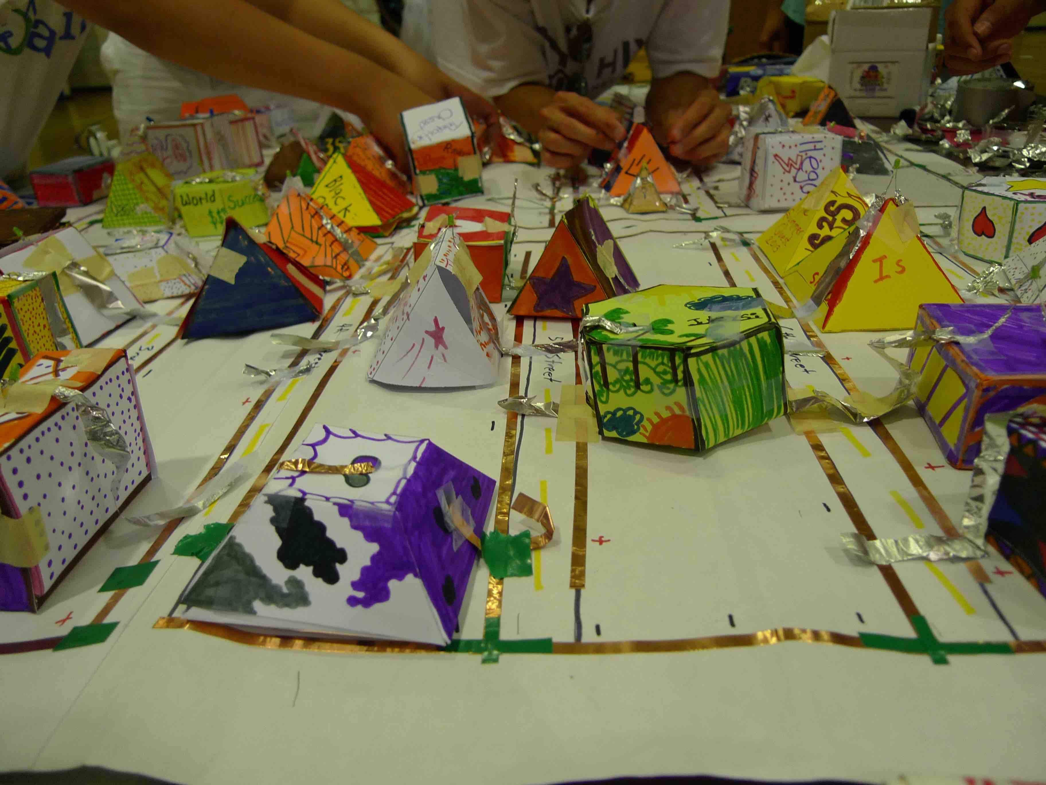 On these maps, the kids would build 3D structures. We brainstormed how to build them, and decided to print different shapes out on paper that they would cut out, design and build. Once that was done, they would place an LED on top, connect it to tin foil and add it to the circuit.