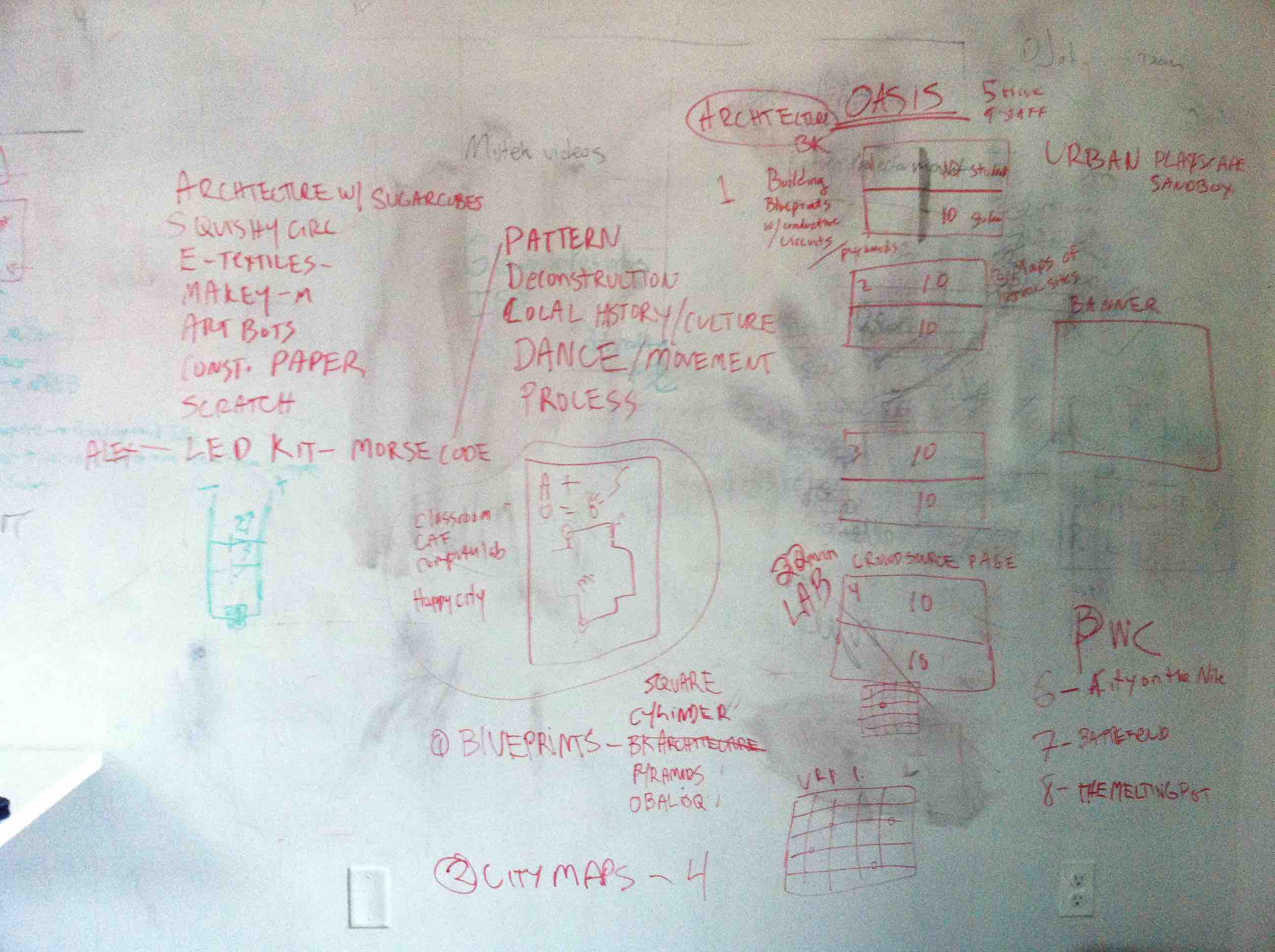 We went to three different sites throughout the Bronx with our activities. We had to plan for a bunch of sessions, with different group sizes ranging from 30 kids to 70 and ages 11-14. We began the process by talking with the program directors for the different sites, and figuring out a common theme between the different programs. We decided based on the themes that we saw to make a grid map for each site depending on the themes. Two groups, a 6th grade and a 7th grade were working on specialized themes (Ancient Egypt and the Civil War, respectively) and we made custom maps for those. For the other programs, there themes tended to be related to cities - Dimension, Immigration, Architecture - so we created a city grid that they would put together.