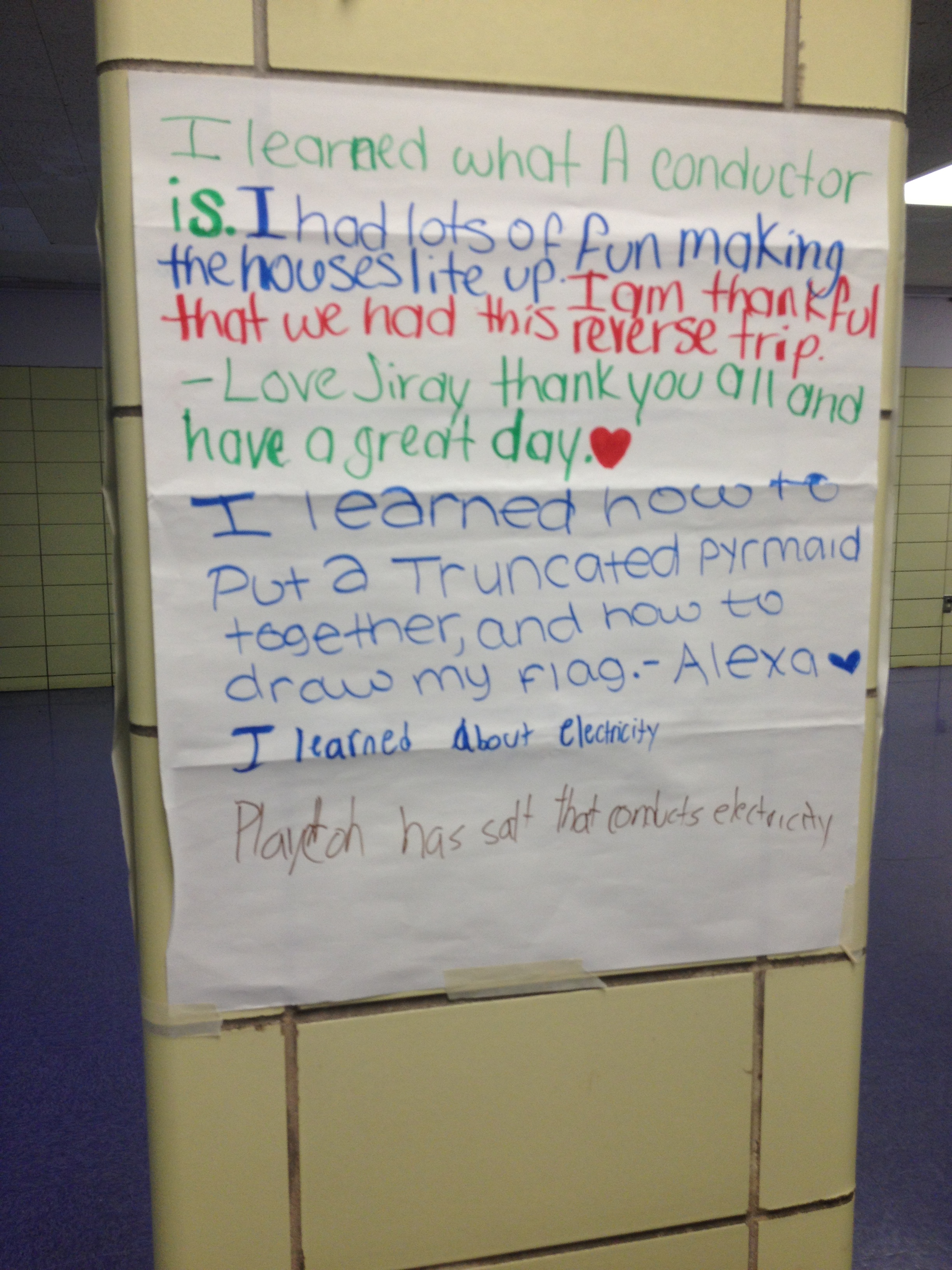 This was our first of the Reverse Field Trips, so we were excited to see how our ideas would pan out in a real situation, and change things off of that. We ran the activities in the gym of a school during the heat wave, so it was really hot.