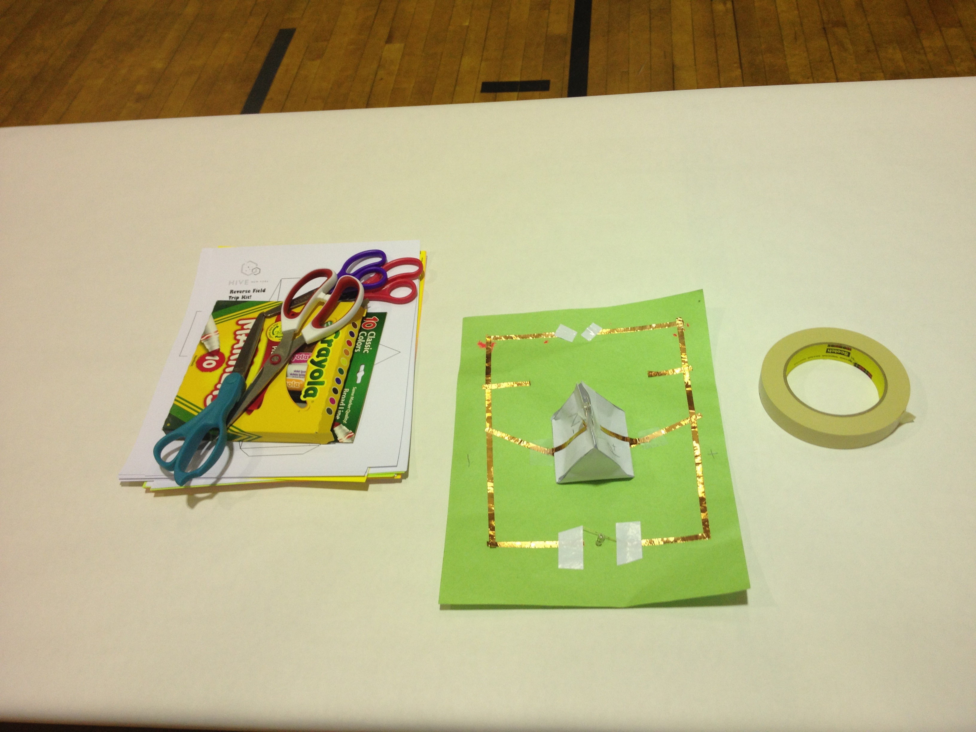 We used a bunch of materials for these events - we used LED's, copper tape, lots of strips of tin foil, markers, paper templates, tape, scissors, cell batteries, battery packs... The list goes on!